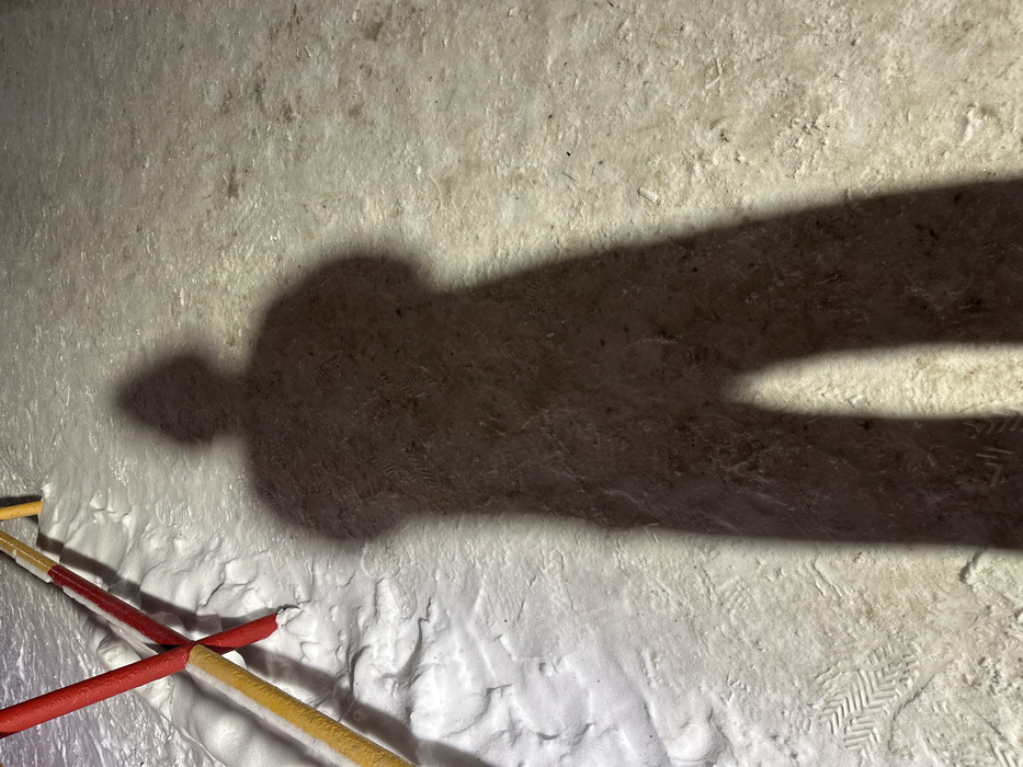 This image depicts a snow-covered ground in the city of Osa, Russia, under artificial illumination, likely at night. A prominent, dark human-like shadow is cast across the central and lower-right portions of the frame, showing the outline of a head, torso, and legs. The ground consists of uneven snow and compacted ice, with various footprints visible, particularly in the lower-left. In the upper-left quadrant, parts of two painted metal poles are visible; one is red and the other yellow, intersecting and partially buried in the snow.