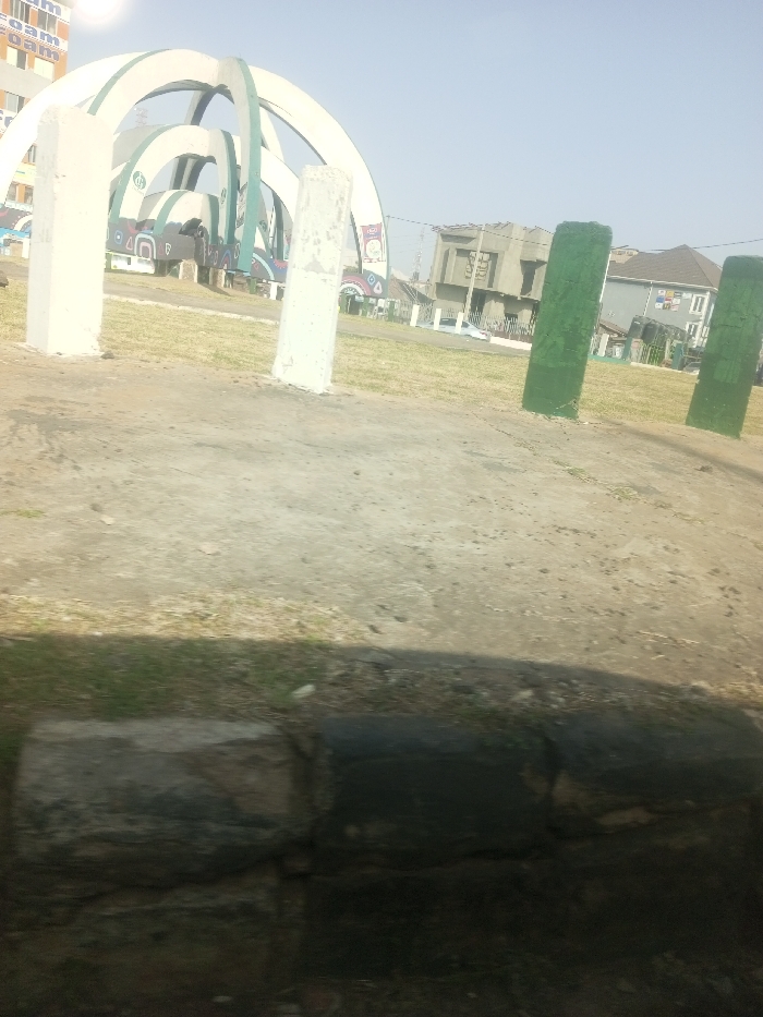 landscape with white and green pillars, likely a park or public area. In the background, there's an arched structure in white and green, hinting at artistic or symbolic significance. Buildings are visible further back, suggesting an urban setting. A concrete foreground is uneven, with a slightly grassy area visible and a dark curb in the lower part of the frame. The overall scene suggests a blend of urban and natural elements within a public space.