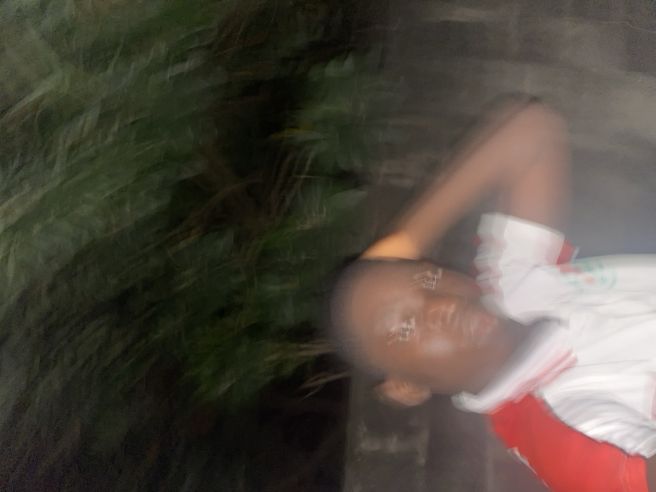 A blurry image shows a person wearing a white and red shirt, seemingly in an outdoor setting with dark greenery on the left