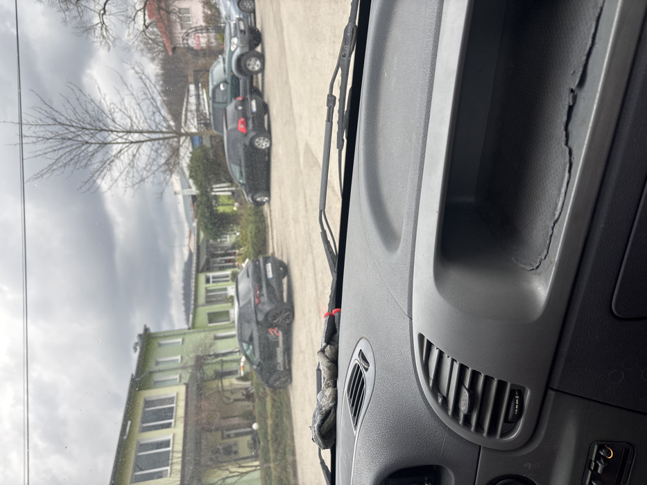 The image depicts an exterior street scene in Gabrovo, Bulgaria, viewed from inside a vehicle, likely a van or truck, given the dashboard configuration. The foreground features the vehicle's gray plastic dashboard, which includes air vents and a storage tray on the right side where the surface material is peeling and damaged. A dark, possibly work glove or cloth, rests near the base of the windshield on the driver's side. The windshield itself appears to have minor dirt or water spots. Beyond the windshield, a paved road or parking area occupies the midground. Several vehicles are parked: a black CUPRA (likely a Formentor model) with red "CUPRA" decals on its lower side, displaying a Bulgarian "CB" license plate, is parked facing away from the viewer. Behind it, a dark gray or black Volkswagen Golf hatchback is also parked, facing the same direction. Further right, a dark green large SUV or pickup truck, possibly a Toyota Land Cruiser, is parked. The background features a cluster of buildings under an overcast sky. On the left, a two-story building with light green facades and multiple white-framed windows is visible. To its right and further back, other buildings with varying colors, including one with a pinkish facade and a metal frame shaped like an arch displaying a "Coca-Cola" sign, are present. Bare deciduous trees are scattered throughout the scene, one prominently centered in the mid-background, indicating a winter or early spring season. Distant hills or mountains, partially vegetated, are visible under the heavy, gray cloud cover. No individuals are visibly present in the frame.