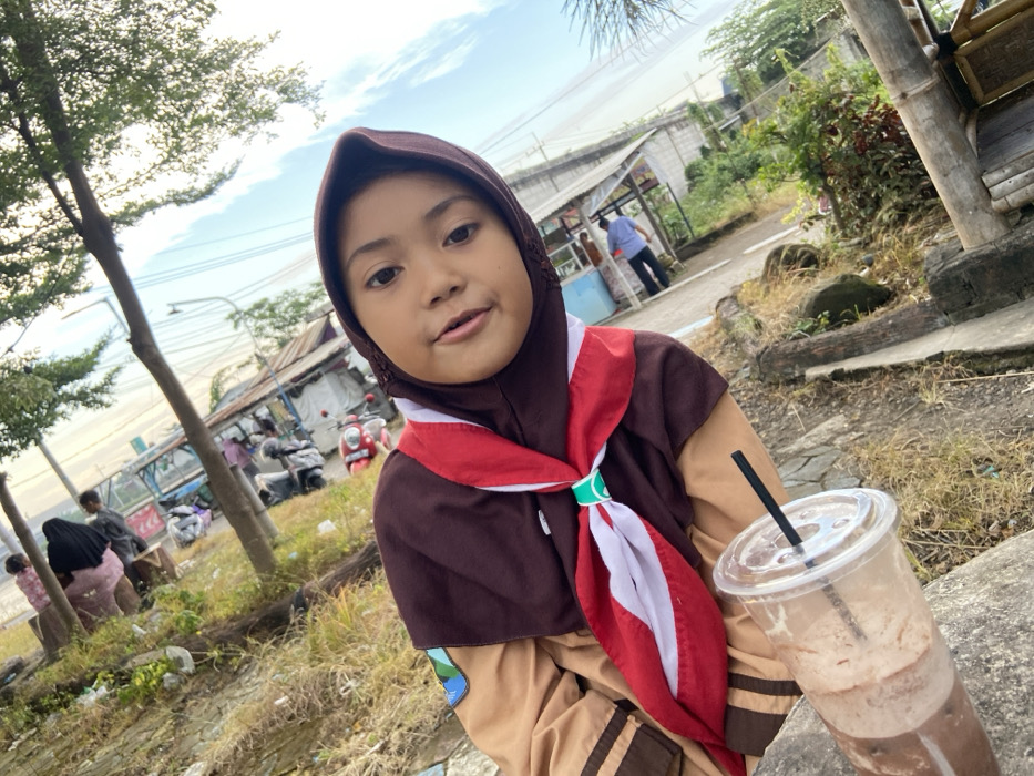 A young East Asian female, dressed in a brown hijab and a scout uniform consisting of a brown top, beige long-sleeved shirt, and a red and white scarf secured by a green woggle with a blue and green badge on her left arm, is positioned in the foreground, looking directly at the camera. To her right, a clear plastic cup with a lid and a black straw, containing a partially consumed light brown beverage, rests on a concrete surface. The background depicts an outdoor setting in Kalitengah, Indonesia, under a partly cloudy sky. Behind and to the left of the subject, a dry, grassy embankment transitions into a semi-urban area with multiple individuals, informal stalls, and parked motorcycles. A broad, light-colored expanse is visible in the far distance on this side. Behind and to the right of the subject, a tree with foliage is prominent, and overhead power lines traverse the sky. Further right, a structure with white netting and an individual in a light blue shirt are observed, with a partial bamboo fence in the lower right of the frame.