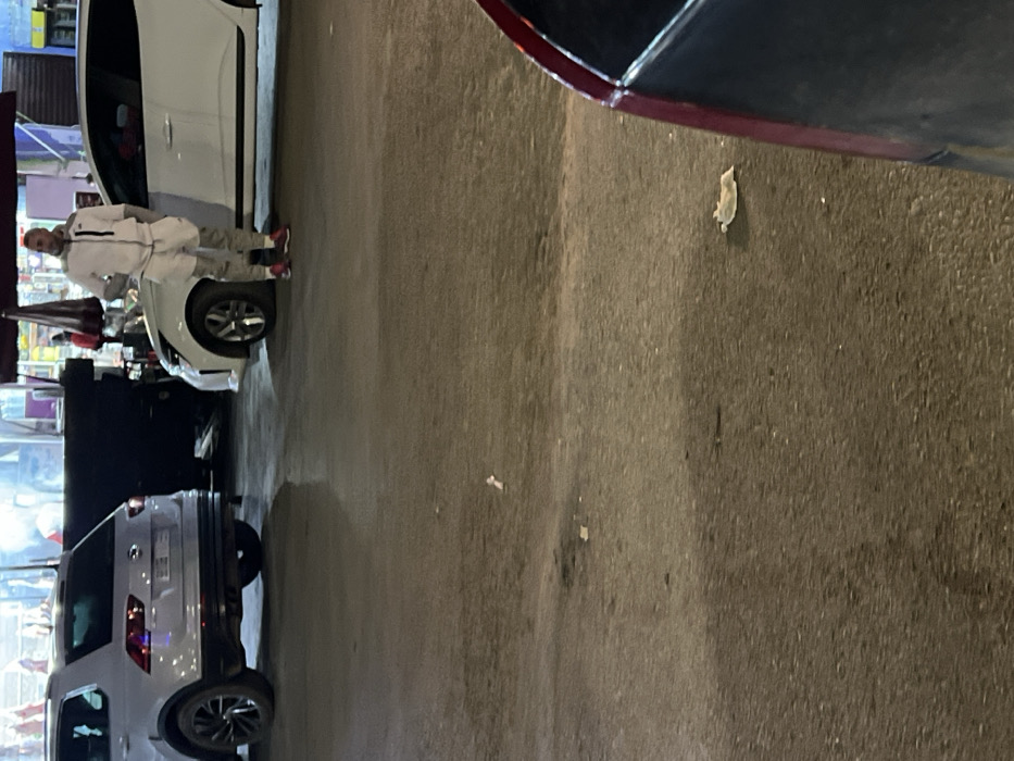 An outdoor shot shows a street with several parked cars. A man dressed in white stands next to a white car. The street is made of gray asphalt with occasional patches. The lighting suggests it is night. Other cars and a store are visible in the background. A small piece of trash lies on the road.