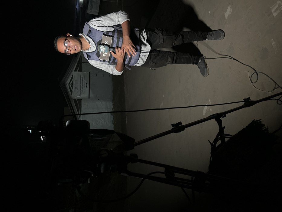 A nighttime scene depicts a male reporter delivering a broadcast in the city of Al-Mawasi, Unknown