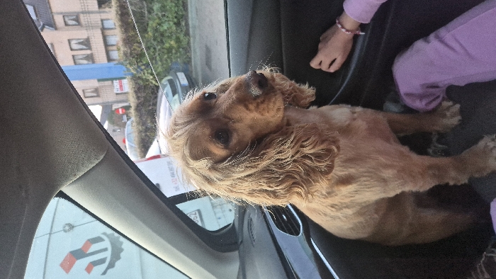 - "The image depicts the interior of a vehicle, focusing on a light brown Cocker Spaniel dog occupying the front passenger seat" by FM-IS3x72, licensed under CC BY 4.0