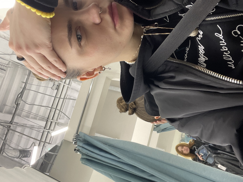 A selfie shows a person indoors, in a space with exposed pipes and fluorescent lighting. The person, with short hair and facial piercings, wears a black jacket with a black hooded sweatshirt underneath. A hand touches the forehead. In the background, draped light blue fabric is visible. Reflected in a mirror are two other people. One has their hair in a bun and is wearing a similar black jacket. The other has longer, lighter hair and wears a black coat while holding a blue bag.