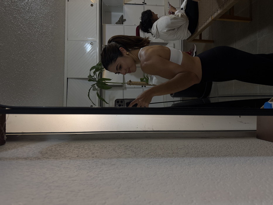 The image depicts an indoor scene, likely a locker room or changing area within a fitness facility, located in the city of Cuernavaca, Mexico. In the foreground, a female subject with fair skin and dark hair tied in a ponytail is shown from the chest down, positioned facing right but looking into a full-length mirror. She wears a white sports bra and black leggings. Her right arm is raised, holding a dark-colored smartphone (appears to be an iPhone with a triple camera array) to capture her reflection. She is in the act of taking a selfie, displaying a subtle smile and a slight turn of her upper body, revealing muscular definition in her shoulders and bicep. The reflection in the mirror reveals the broader environment and a second individual. The mirror reflects a series of white lockers with horizontal ribbed patterns and circular handles, mounted above a long, woven-top wooden bench. A potted green plant with a fibrous-wrapped stem stands between the two subjects in the reflection. Seated on the bench to the right of the primary subject's reflection is a second female, exhibiting darker skin and curly hair, dressed in a light-colored hooded sweatshirt and dark pants. This individual is observed looking down at a white-cased smartphone held in her hands, engrossed in its use. The floor appears to be a dark, possibly tiled surface. The wall to the immediate left, outside the mirror's frame, is a white, heavily textured stucco.
