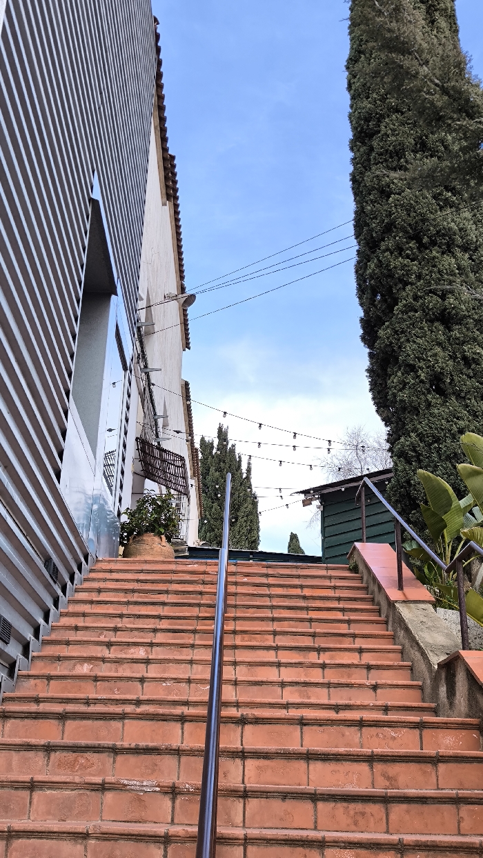 A long, steep staircase with orange tiles and a central metal railing stretches upwards between buildings and trees