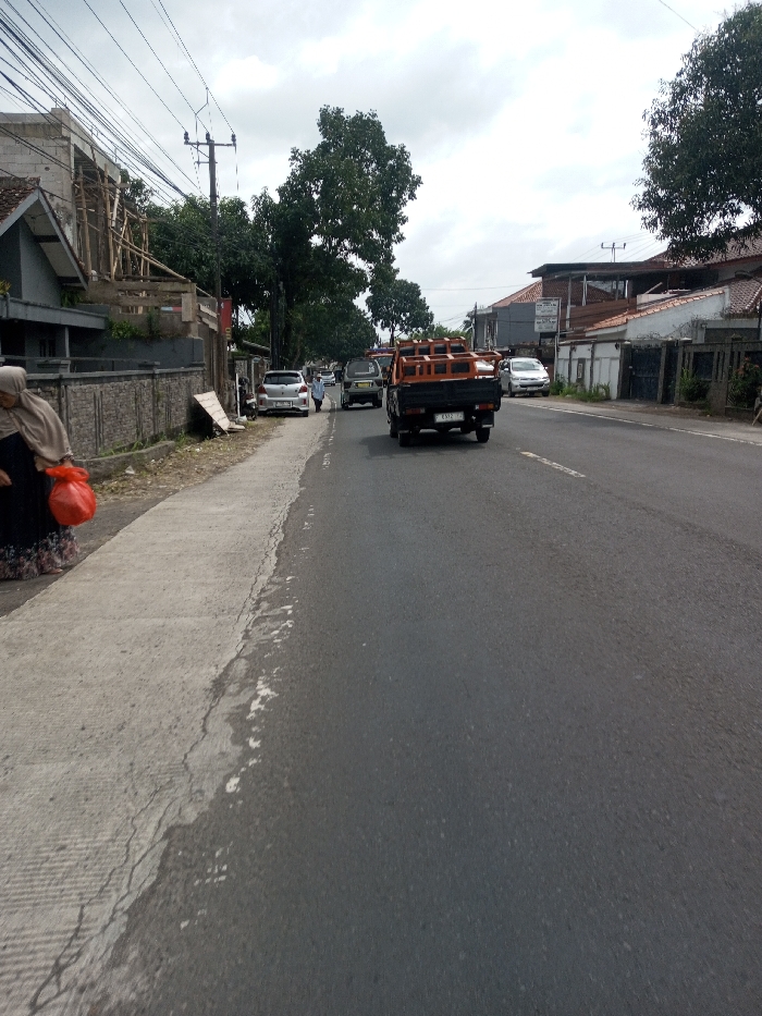 The image displays a street scene in Khajuripada, India, under an overcast sky. A two-lane asphalt road with a broken white center line extends from the foreground into the distance. A concrete sidewalk is present on the left. An individual, appearing to be an elderly woman wearing a light head covering and a dark floral-patterned dress, is partially visible on the left sidewalk, holding a red plastic bag. On the road, a dark-colored pickup truck with an orange-framed bed and license plate "E 5372" is in motion, moving away from the viewer. Behind it, a dark SUV and a white sedan are visible. A silver hatchback is parked on the left side of the road. The left side of the scene features a low stone wall, behind which a building under construction or renovation, characterized by white walls, a brown tiled roof, and exposed wooden scaffolding, is present. Multiple utility poles support numerous overhead wires along this side of the street. Large trees with dense green foliage are dispersed throughout the scene. On the right, various residential or commercial buildings with white facades and red-tiled roofs extend into the distance, one structure exhibiting an upper level with a railing.
