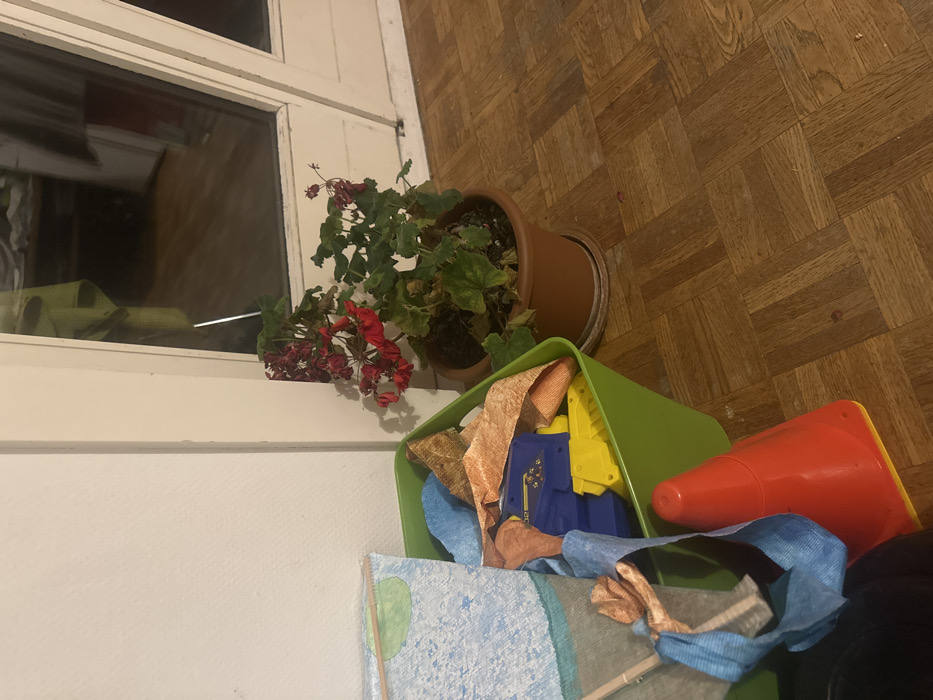 An indoor scene in Villaz, Switzerland, displays a cluttered corner of a room. The floor is covered with light brown parquet flooring arranged in a square pattern, showing some dust and minor scuffs. A white wall occupies the left side of the frame, meeting a white-framed double glass door or window on the right. The glass reflects a blurry interior space, possibly another room, showing dark shapes and a faint green item. In the lower left, a bright green rectangular plastic storage bin is partially visible, containing various items. These include crumpled blue fabric, light orange patterned fabric, a blue toy gun with yellow accents and a paw print logo, and a yellow toy component. A small, red plastic traffic cone toy with a yellow base rests on the floor in front of the green bin. A dark, indeterminate object is partially visible in the bottom-left corner. To the right of the green bin, positioned near the glass door/window, is a terracotta-style potted plant. The plant, likely a geranium, features green leaves and clusters of red flowers, some of which appear wilted or dried. The pot sits on a beige saucer. No people are present, and no actions or interactions are depicted.
