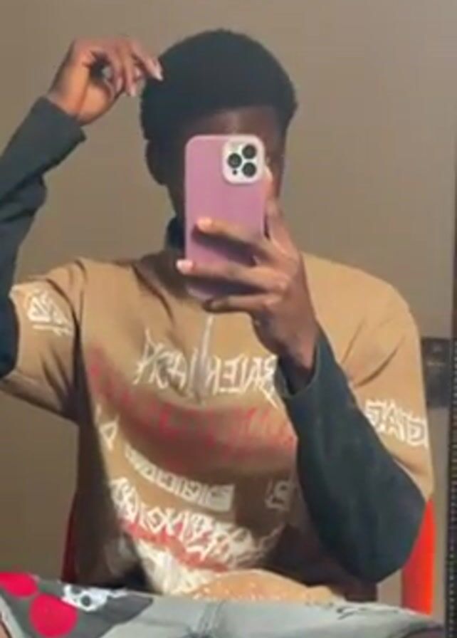 A person stands in front of a mirror, holding a cell phone in front of their face, partially obscuring it. They touch their short, dark hair with their right hand. The person wears a brown t-shirt with a red graphic design, a black long-sleeve undershirt, and gray shorts with red patches. They sit in an orange chair. The background shows a plain wall.