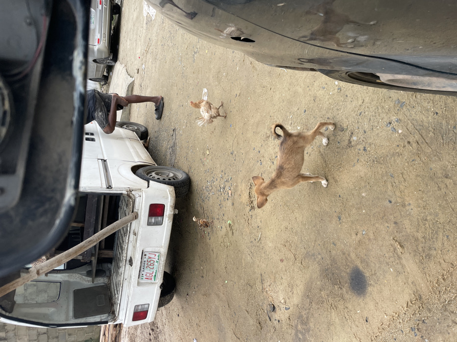 The scene depicts an unpaved, sandy-dirt area in Badore, Nigeria. A white, compact utility van with its tailgate open occupies the left-center, revealing wooden structures inside. The vehicle's rear license plate, "LAGOS AGL 265YJ," is visible. A person, visible from the mid-thigh down, wearing dark shorts and black sandals, stands next to the van's right side, facing away from the camera. In the foreground, a light brown puppy with white paws stands facing right, its tail curled upwards. Behind the puppy and to its right, a light brown adult hen walks. Further back, near the rear of the white van, a small chick is present. The view is partially obstructed on the right by the dark body and wheel of another vehicle. In the background, a concrete block wall and a silver vehicle are visible. The ground is characterized by loose dirt, scattered small stones, and some darker, damp-looking patches.