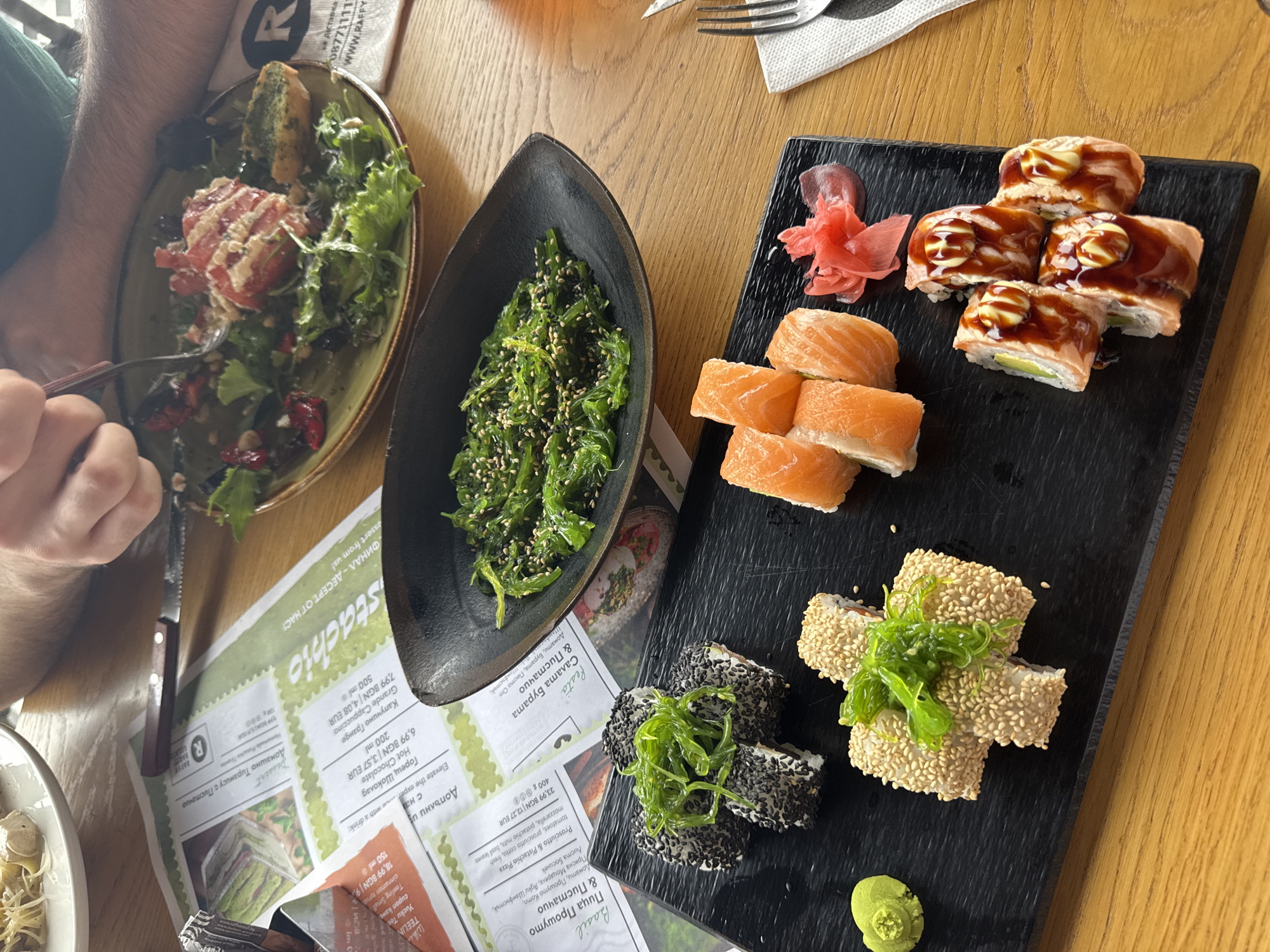 wooden table in a restaurant in Sofia, Bulgaria. On the table are a salad, seaweed salad, and a sushi platter. A person is eating the salad with a fork. There are also restaurant menus and cutlery on the table. The menus are for Pistachio Restaurant and Raffy Gelato Bar in Sofia, Bulgaria.