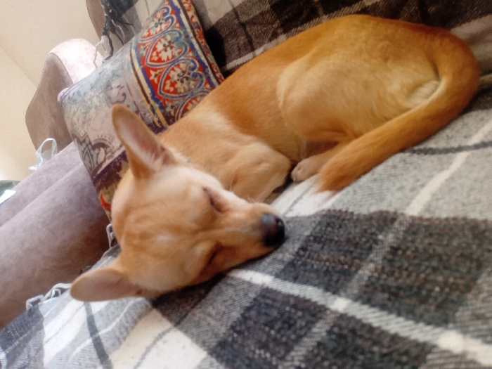 - "In the city of Parand, Iran, a small, light brown dog is observed sleeping in a curled position on a grey and white plaid blanket" by FM-jqQSo1, licensed under CC BY 4.0