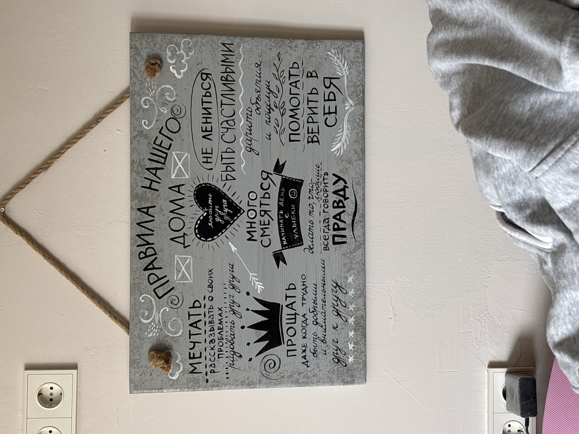 A photograph shows a sign hanging on a wall. The sign is gray with white writing in Russian. It is attached to the wall with a piece of rope. The sign has the following text: "RULES OF OUR HOME. Dream. Tell about your problems. Please each other. Forgive even when difficult. Be kind and attentive to each other. Do not be lazy. Be happy. Give hugs and kisses. Laugh a lot. Start the day with a smile. Do what you love. Always tell the truth. Help each other. Believe in yourself." A light gray hoodie is partially visible on the right side of the image. There are two electrical outlets on the wall, one on each side of the sign. The location of this image is likely in a residence, and is not discernible to be from the city of Minsk, Belarus.