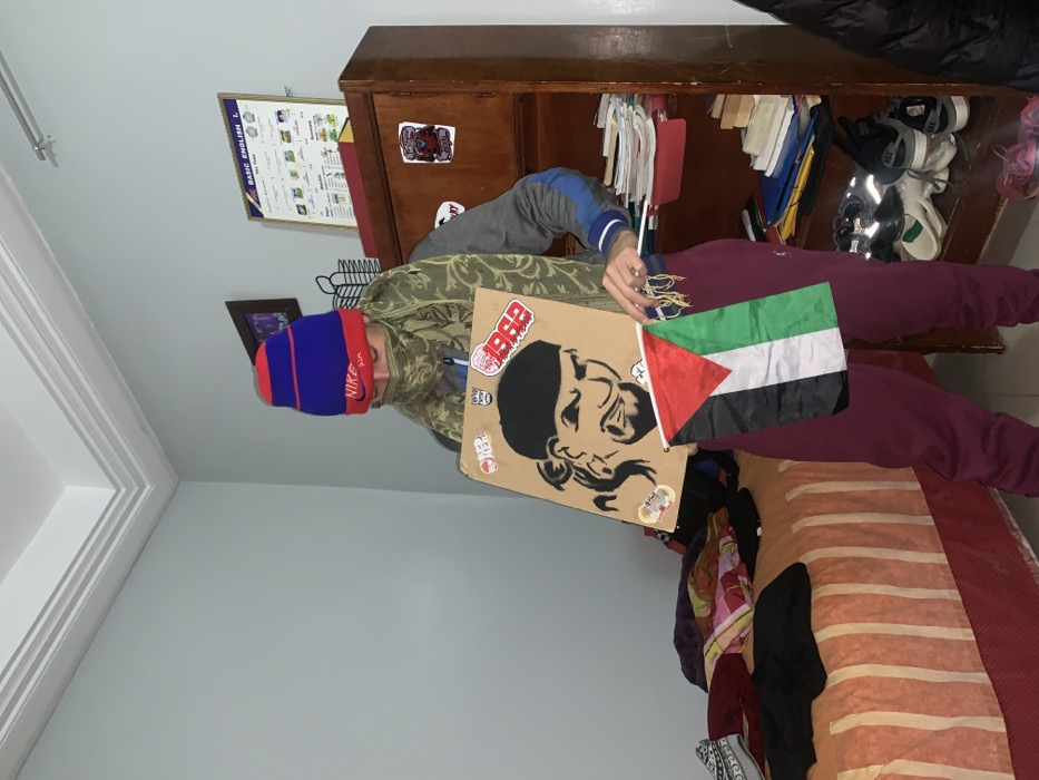 A person wearing a blue and red hat holds a sign with a black and white stencil portrait and the number "1962" on it, along with a small Palestinian flag. The individual is wearing a patterned jacket and maroon sweatpants, positioned in what appears to be a bedroom. A wooden cabinet is in the background, with clothes hanging inside. A bed with striped bedding is visible in the lower portion of the image. A framed poster hangs on the wall.