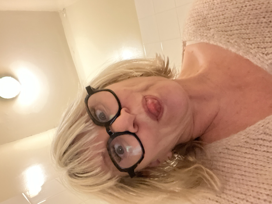 A blonde-haired female subject, viewed from a low angle, occupies the majority of the frame in an interior setting in La Fouillouse, France. She is wearing black-framed eyeglasses, a light-colored, possibly beige, knit sweater, and appears to have earrings. Her eyes are wide open, and her tongue is extended from her mouth. The background consists of light-colored walls, with a white tiled section visible to the lower right. A single circular flush-mount light fixture is illuminated on the ceiling directly above the subject.
