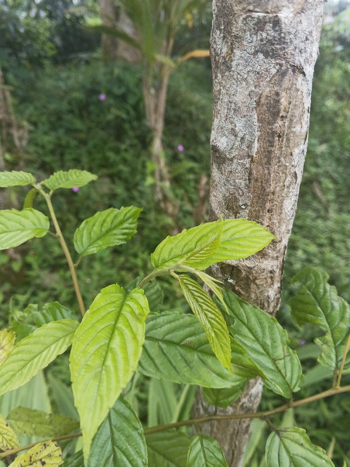 The image displays a close-up view of vegetation within the city of Unknown, Vietnam. In the foreground, a branch bearing numerous ovate green leaves is prominent, with newer, lighter green leaves and darker, more mature foliage exhibiting distinct venation. Some leaves show minor blemishes. To the right, a vertical tree trunk with textured greyish-brown bark, possibly covered in lichen, occupies a portion of the frame. The background consists of blurred, dense green foliage, suggesting an outdoor natural environment, with two small, indistinct purple flowers visible amidst the greenery. No people or discernible actions are present.