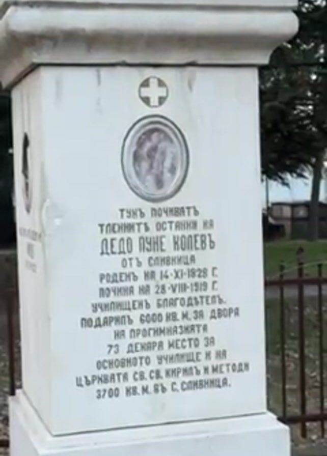 white stone monument in an outdoor setting. The monument has an inscription in Cyrillic script and a circular portrait embedded in its surface. The camera zooms out to reveal a bust of a man in traditional clothing atop the monument. The monument is surrounded by a low, dark metal fence and the ground is paved with gray stones. Evergreen trees are visible in the background. The sky is overcast.