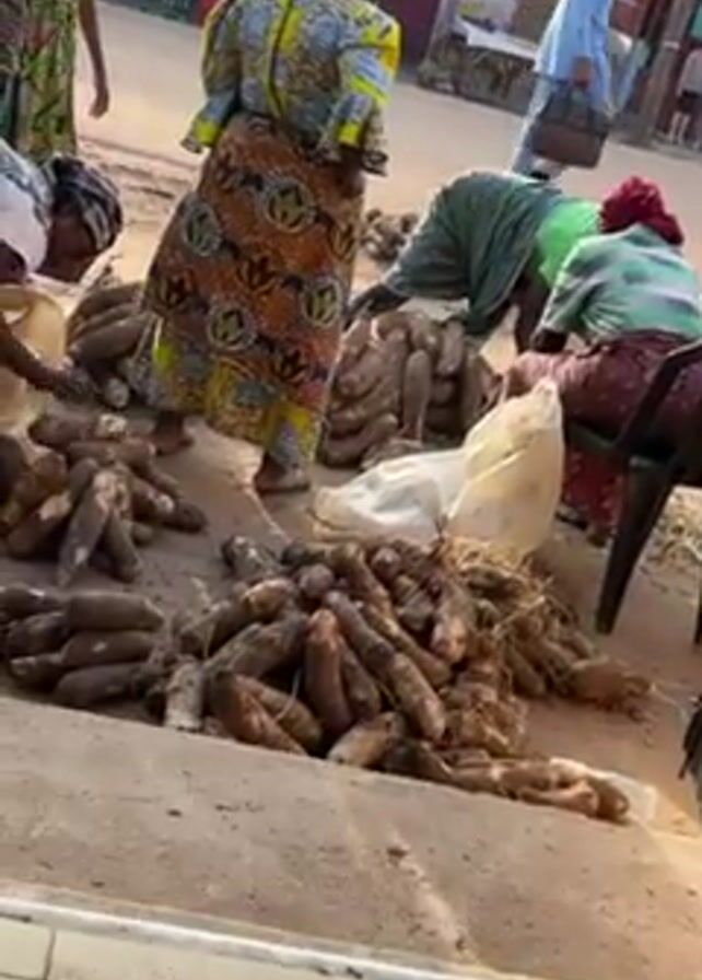 group of people gathered around piles of what appears to be yams at an outdoor market or roadside setting