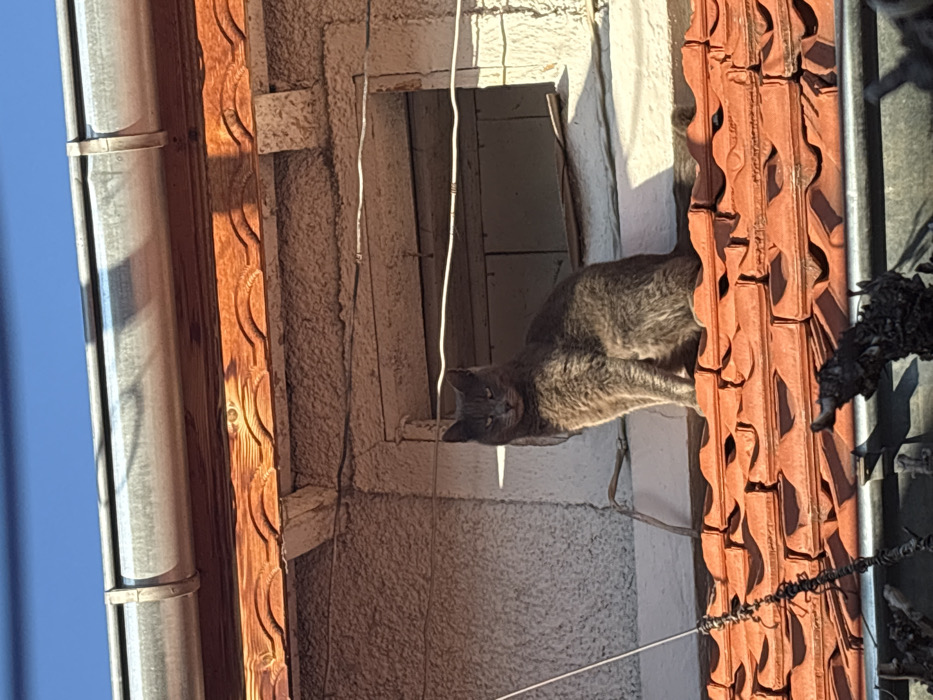 - "A dark gray domestic cat is positioned centrally on a sunlit, terracotta-tiled roof in Dinkata, Bulgaria" by FM-WZ4nk1, licensed under CC BY 4.0