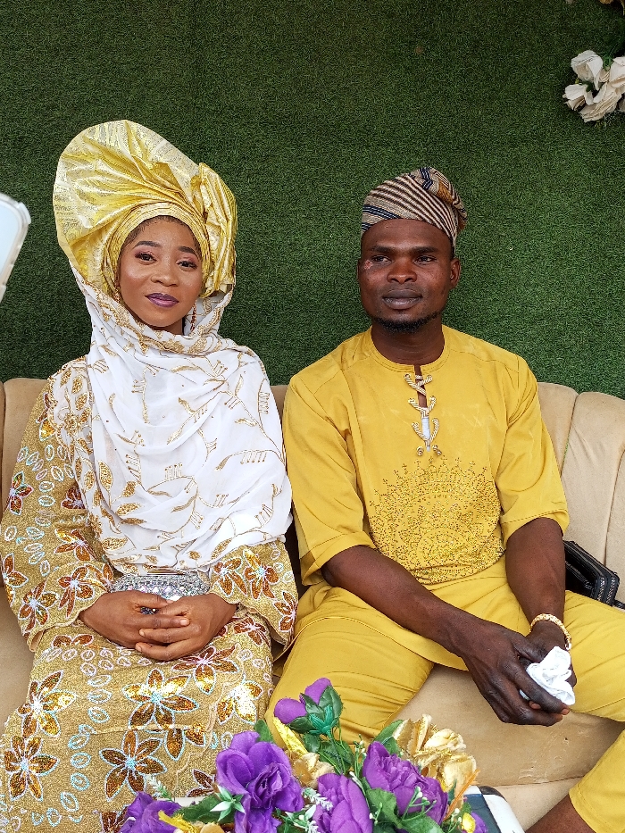 Two individuals, a woman and a man, are seated side-by-side on a light brown, pleated upholstered sofa. The woman, positioned on the left, has dark skin and wears an elaborate gold gele headwrap over a white head covering with gold embroidered motifs. She is dressed in a traditional Nigerian outfit featuring a gold and white patterned fabric with floral and leaf designs, and long sleeves. Her hands are clasped over a metallic silver clutch bag resting on her lap. She looks directly forward towards the viewer, displaying purple lip color. The man, on the right, has dark skin, a short beard, and a visible mark on his left cheek. He wears a mustard yellow traditional Nigerian garment with intricate gold embroidery on the chest and a striped cap (fila) in brown, beige, and dark blue tones. His right wrist has a gold-colored bracelet, and he holds a crumpled white cloth in his hands on his lap, looking slightly to his right. The background is a green artificial turf wall decorated with white artificial floral accents. In the lower foreground, an artificial floral arrangement with prominent purple and gold elements is visible. This scene is located in Erin-osun, Nigeria.