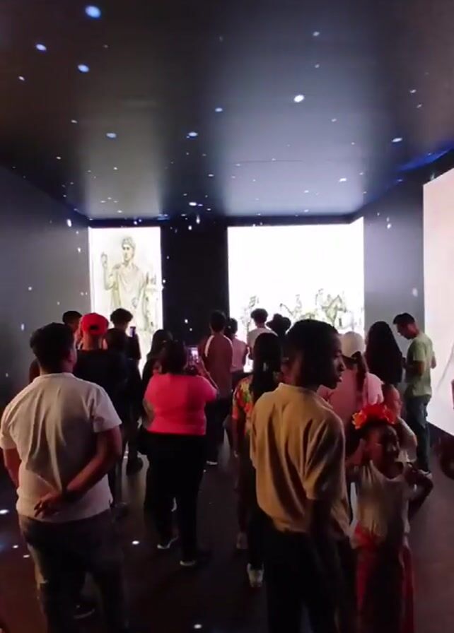 dimly lit room filled with people. They appear to be at an exhibition or museum, standing and looking at large screens displaying images of historical drawings and portraits. The ceiling is dark with scattered blue lights resembling stars. The screens are arranged along the walls, and the people are facing them, some taking photos with their phones. The atmosphere seems calm and focused on the visual display.