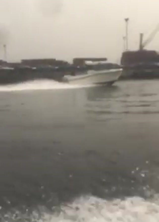 boat moving through a body of water on a cloudy day. The camera is on a second boat, focusing on the wake. In the background, a dock or port area is visible with stacked shipping containers and cranes. Another boat passes by in the distance.