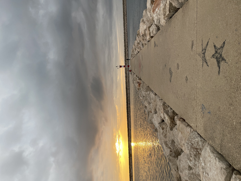 The image depicts a concrete pier extending into a body of water in the city of Bar, Montenegro, at either sunrise or sunset. The pier is flanked on both sides by breakwater structures composed of large, light-colored rocks. At the far end of the pier, a small cylindrical lighthouse or navigation marker with red and white horizontal stripes is visible. A single human figure stands near the base of this marker, facing towards the left. The sky is predominantly covered with dense, dark grey clouds, but a bright golden-orange light is present on the left horizon, indicating the sun's position. This light reflects strongly on the water surface to the left of the pier, creating a shimmering golden path. The water to the right of the pier appears darker and calmer. On the concrete surface of the pier in the foreground, two hand-drawn black star shapes are visible, along with faint, illegible markings further down the pier, including what appears to be a heart shape.