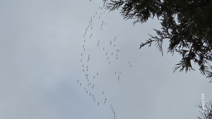 The scene depicts an overcast, pale grey-blue sky over Ottonville, France. A large flock of approximately 60 to 80 dark-silhouetted birds, consistent with cranes or similar migratory waterfowl, is visible in the upper and central portions of the sky. The birds are primarily flying in a loose V-formation and dispersed groups, moving generally from left to right across the frame. The lower right and a small part of the lower left of the image are occupied by the dark green foliage and branches of coniferous trees. No human subjects or man-made objects are present, apart from a "Galaxy S25" watermark in the lower left corner.