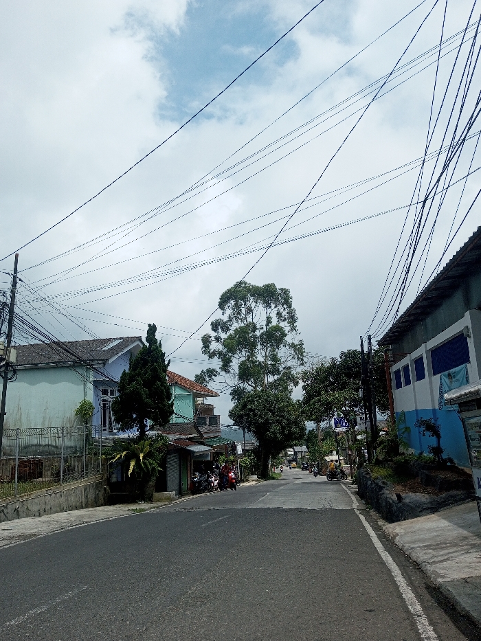 A street scene under a cloudy sky is depicted. Power lines crisscross overhead. Houses of varying colors line the left side of the street, while a building with blue accents stands to the right. Trees provide a canopy over the road further ahead. Several motorcycles are parked near a small shop, and a few vehicles are visible in the distance down the street. The road itself is asphalt, with a sidewalk running alongside the right side.