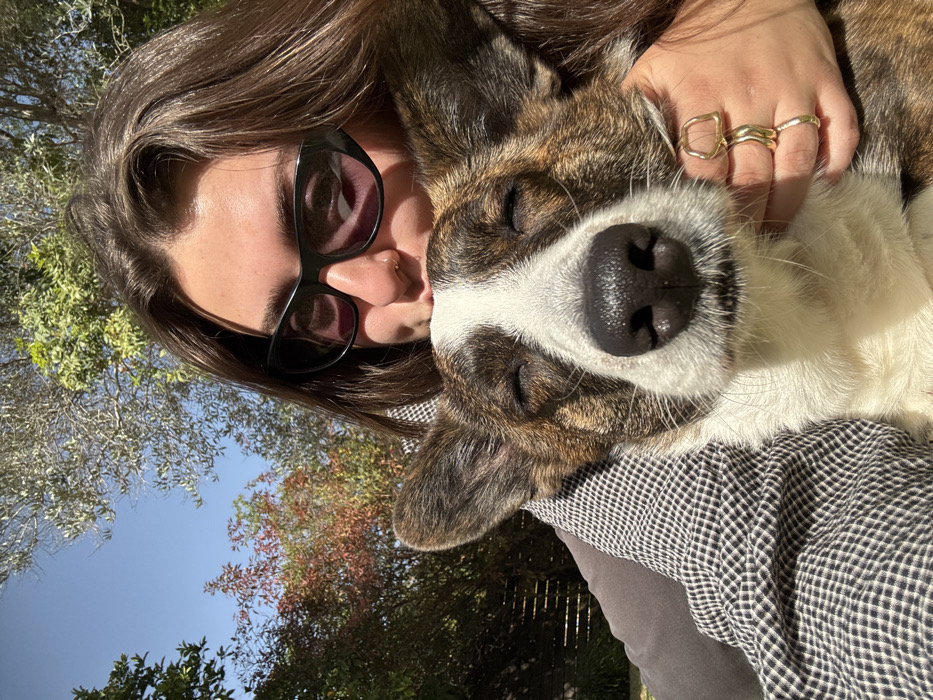 A female subject is depicted outdoors in Ramat HaSharon, Israel, holding a brindle and white dog