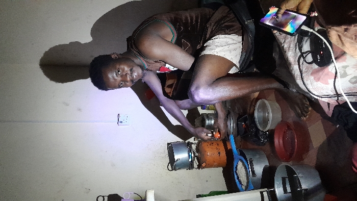 A man crouches beside a makeshift kitchen, a counter supporting multiple pots and a small, orange gas tank. He fiddles with the tank valve, preparing to cook. A phone, seemingly charging, lies on a bed nearby. The room, dimly lit, shows a stark white wall with an electrical outlet. The individual wears a brown tank top and light-colored shorts. Several plastic containers are scattered on the floor.