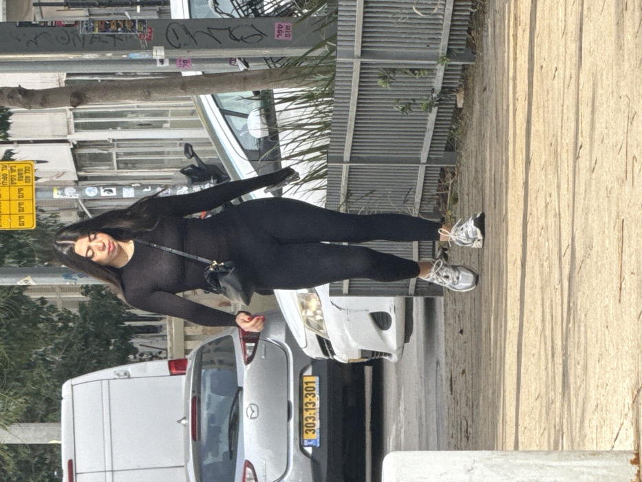A woman in a black body suit, wearing silver sneakers, is standing on a sidewalk. She has long dark hair and is carrying a small black purse. Several vehicles, including a white van and a silver car with the license plate "303:13:301," are visible on the street. A metal fence runs along the back of the sidewalk, next to a wooden path. The scene appears to be outdoors in an urban setting.
