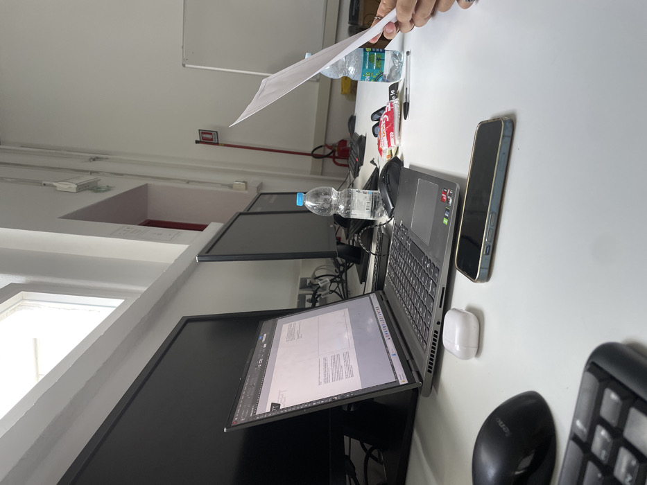 A white desk holds two monitors, a partially opened laptop, an iPhone, and AirPods. A keyboard and a mouse are also on the desk. In the background, a person holds a piece of paper over a water bottle. Another water bottle sits near the back monitor. The desk is against a white wall, which features a red fire alarm.