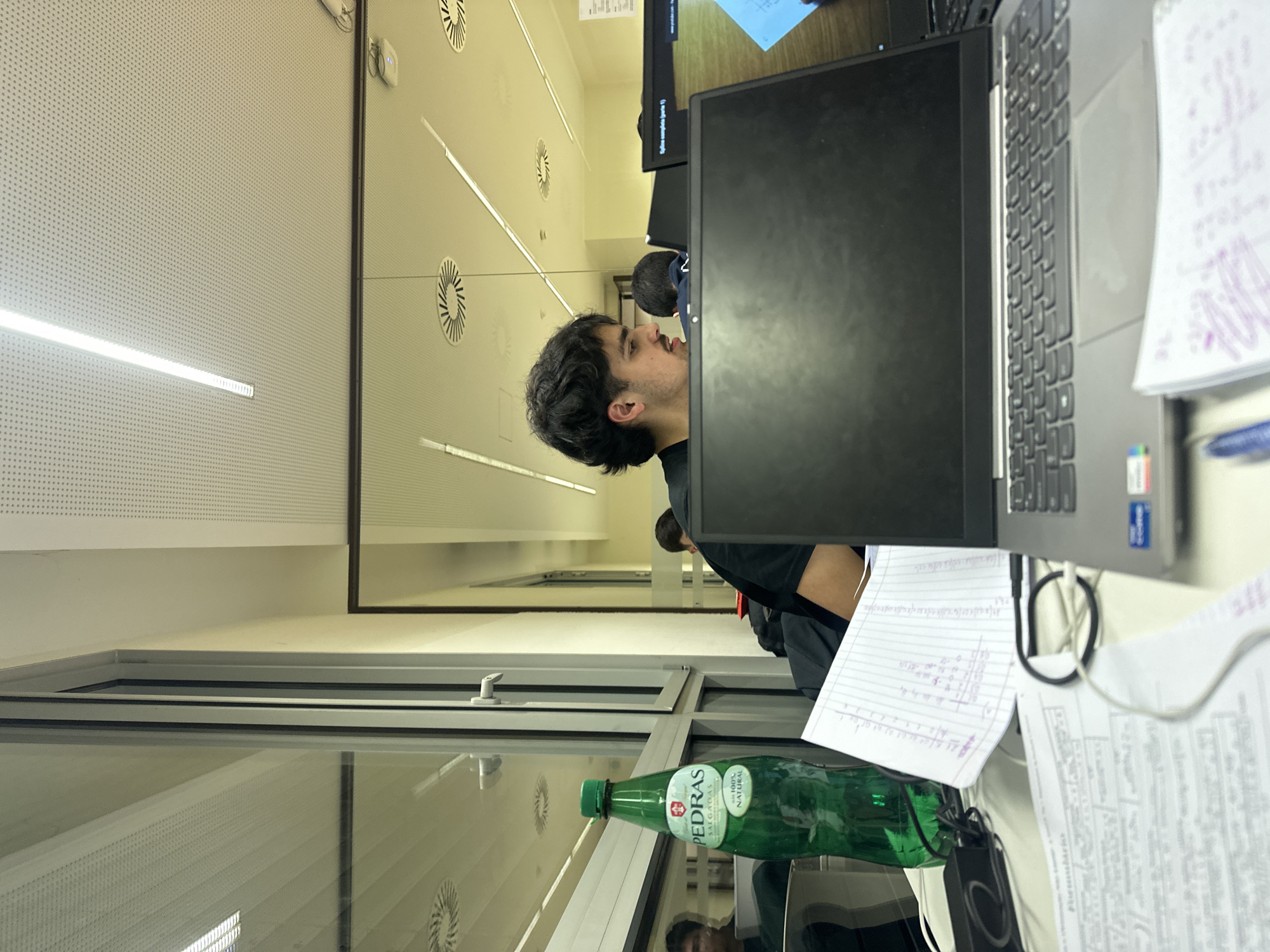 The scene depicts an indoor, modern study or work environment located in Guimarães, Portugal, likely within a university or library setting. A young male with dark, wavy hair and a light mustache is seated at a light-colored desk in the mid-ground, observed in profile, wearing a black short-sleeved shirt. He appears focused, looking towards the right side of the frame. A grey laptop with an Intel sticker is open on the desk directly in front of him, its screen facing away from the viewer. Various objects are arranged on the desk: a green plastic bottle of "PEDRAS SALGADAS" mineral water with a green cap stands prominently on the left. Scattered around the laptop are multiple sheets of paper, including a ruled notebook page with handwritten notes in purple ink, and other printed documents with text and equations. Black spectacles, a blue pen, and several cables (white and black) are also present on the desk. The background reveals a spacious room with a white, perforated ceiling featuring linear LED light fixtures and circular air vents. A large window or glass partition on the left reflects parts of the room, including another seated individual. To the right of the main subject, another person's back and head are visible, seated at a workstation. A glass partition further to the right reflects a computer screen displaying content titled "Splines complete (parte 1)," indicative of academic study. The overall environment suggests a collaborative or shared workspace with ample artificial lighting.
