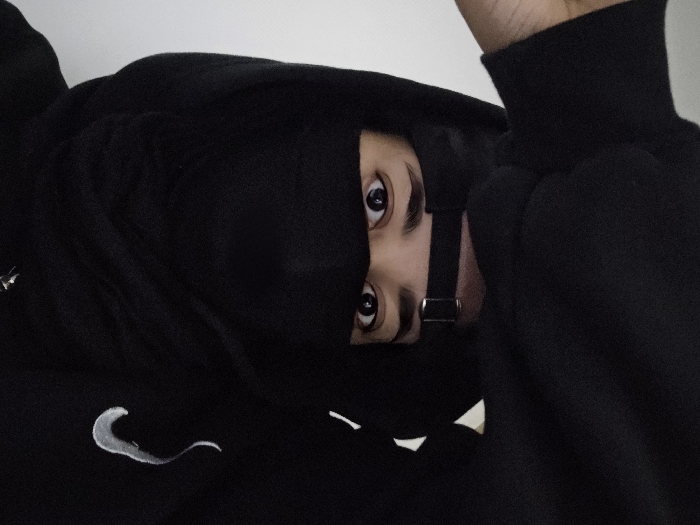 The image showcases a person mostly obscured by a black hooded sweatshirt. Their face is partially visible, focusing on their eyes and a face mask. The hood is up, shadowing the face. A black strap with a metallic buckle is placed around the person's lower face. The sweatshirt has a logo on the front, appearing as a white curved shape alongside pointed shapes. The overall composition of the photo appears to be rotated.