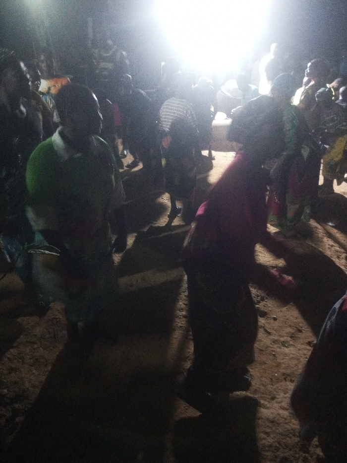 A group of people gather under bright lights, likely outdoors at night. Individuals wear diverse clothing, including a green collared shirt, striped top, and colorful patterned fabrics. Shadows are prominent on the ground, indicating the intensity of the light source. The scene suggests a community event or celebration.