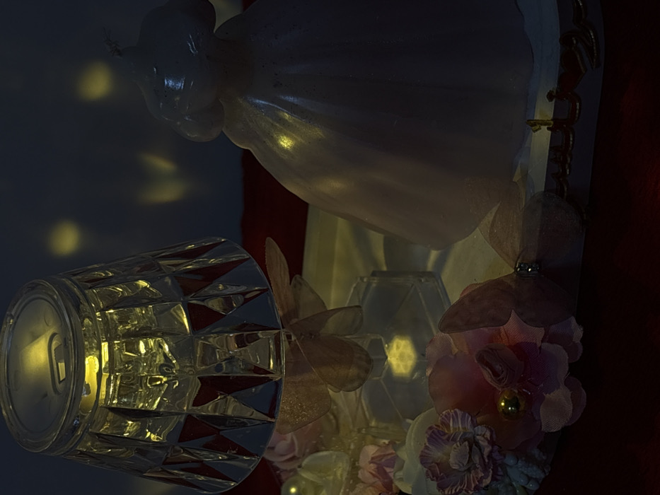 - "crystal-patterned glass tilted to the left, its interior illuminated with a warm light" by FM-ihvq52, licensed under CC BY 4.0