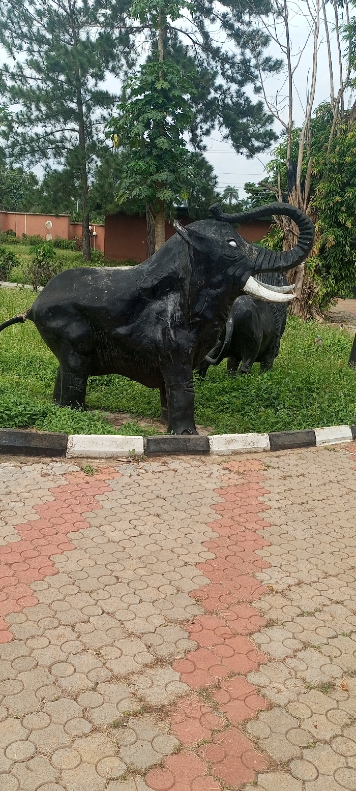 The image displays an outdoor scene in Ila Orangun, Nigeria, featuring two elephant sculptures within a landscaped area