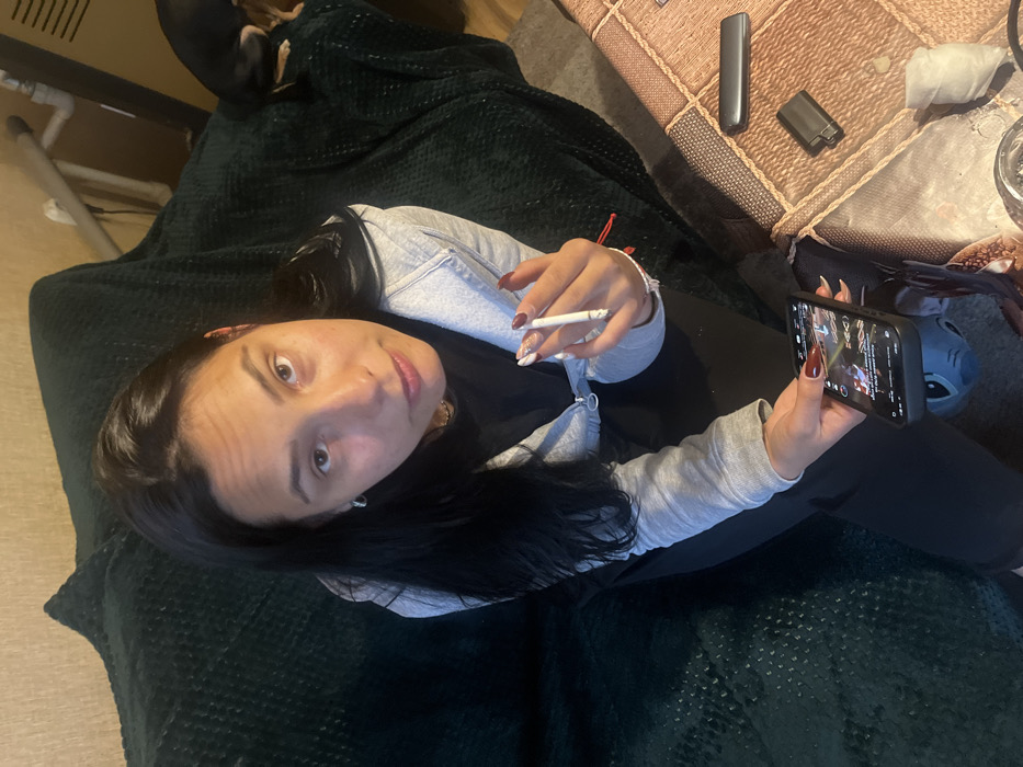 The image depicts an indoor scene in Sofia, Bulgaria, focusing on an adult female from an elevated perspective. The female, with long dark hair, light complexion, and a neutral expression, looks directly at the camera. She is seated, wearing a light grey hooded zipper jacket over a dark shirt and dark pants. Her right hand holds a lit cigarette with a white filter, revealing long, pointed nails painted dark red with white and gold accents. A red string bracelet is visible on her right wrist. Her left hand holds a black-cased smartphone, displaying an active screen, with her thumb positioned as if interacting with it. She is situated on a dark green, textured sofa or armchair, covered with a blanket. To her right, a low table or surface is visible, covered with a patterned textile in shades of brown and beige. On this surface, a black rectangular electronic device, a smaller black cube-shaped item, a crumpled white object, and a glass ashtray containing ash are present. In the background, behind the female on the sofa, a small, dark-colored dog is partially visible, facing away from the camera. The wall behind the sofa is light brown, with a metallic pipe system running along it.