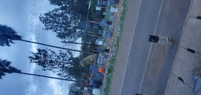 A street scene shows a row of objects displayed on a fence or border, alongside a road. The objects appear to be containers, possibly pots or buckets, in various colors. A tan, draped figure or statue stands among them. A utility pole is visible on the side. The sky is overcast, and tall trees line the horizon. A section of gray road with a concrete barrier runs along the right side of the image.
