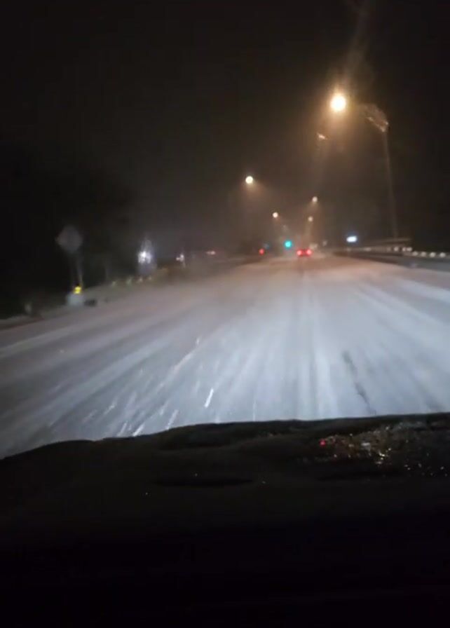 car driving on a snow-covered road at night. Streetlights illuminate the road, and the headlights of cars ahead are visible. The dashboard of the car the video is taken from is visible in the foreground, covered in snow and water. Snow is falling. The road is a highway with a barrier on the right side. The view is from inside the moving vehicle, looking forward.