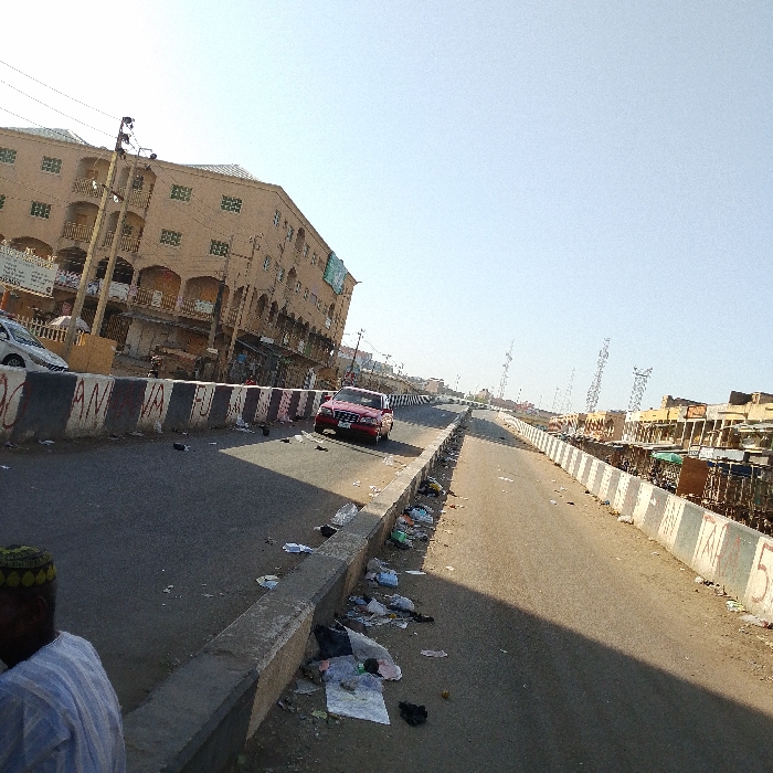 The scene depicts a street in Sabon Gari East, Nigeria, under a clear, bright sky. A multi-lane asphalt road, likely an elevated section or flyover, recedes into the distance. It is separated by a concrete median barrier. The barrier section on the left is painted with alternating black and white stripes. The barrier on the right side features alternating green and white painted sections, with numbers such as "5" visible. On the far left, a multi-story building with a light-tan facade and arched windows or balcony openings is visible. Partial signage on this building includes the words "GENUS" and "TRADERS." A white vehicle's front section is partially visible near the base of this building. Utility poles and overhead lines are present along this side of the road. A red sedan, resembling a Mercedes-Benz, is situated on the left lane of the road, facing away from the camera. In the distance on the right side, clusters of low-rise structures, possibly market stalls, are apparent. Several tall, metal utility or communication towers are visible against the horizon. Throughout the scene, particularly along the median barrier and the road's edges, an accumulation of litter, including plastic bags, paper, and various debris, is evident. In the bottom-left foreground, the back and partial side of a human figure are visible. This individual is wearing a light-colored, vertically striped garment and a green-patterned cap. They are positioned on the roadside, facing generally away from the immediate center of the image.