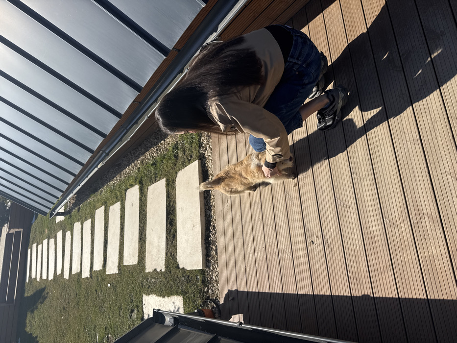 A forensic description of the scene in Căciulați, Romania, reveals an outdoor setting on a sunny day. The primary focus is a person, observed from behind, crouched on a light brown wooden deck with horizontal planks. This individual has long, dark hair and is wearing a tan jacket, blue jeans, and dark athletic shoes. Their right hand is extended towards a small, light brown, fluffy-tailed dog positioned in front of them on the deck, suggesting an act of petting or interaction. To the left of the deck, a grassy area features a pathway constructed from numerous rectangular, light-colored concrete stepping stones ascending an incline. Parallel to the wooden deck on the right, a series of dark, angled panels, consistent with solar panels, are visible, extending upwards and out of the frame. A grey gutter system runs along the base of these panels. Further up the grassy incline, a raised wooden terrace or structure is present. Harsh sunlight from an unseen source to the left casts long, distinct shadows of the person and the dog onto the wooden deck.