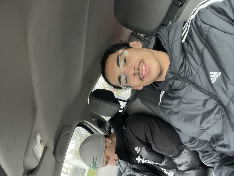 The scene depicts two male individuals seated inside a vehicle in Eckbolsheim, France. In the foreground, a male subject is visible from the chest up, positioned to the right of the frame. He has dark hair, wears clear-framed eyeglasses, and exhibits dental braces on his upper and lower teeth. He is wearing a black puffer jacket with white stripes on the sleeves and an Adidas logo on the left chest. He looks directly towards the camera with a slight smile. To the left and slightly behind the primary subject, a second male is visible, positioned further into the vehicle's interior. He is turned to his left, looking downwards and away from the camera. He wears a grey knit beanie with a green crocodile logo, identified as Lacoste, on the front. He is also wearing a black puffer jacket with a partially obscured white logo or text on the left chest area. The vehicle's interior features a light grey ceiling with an overhead light fixture and a grab handle. The car seats are upholstered in grey and black fabric. Through the vehicle's windows, blurred outdoor elements are visible, including bare trees and distant structures, indicating daylight conditions.