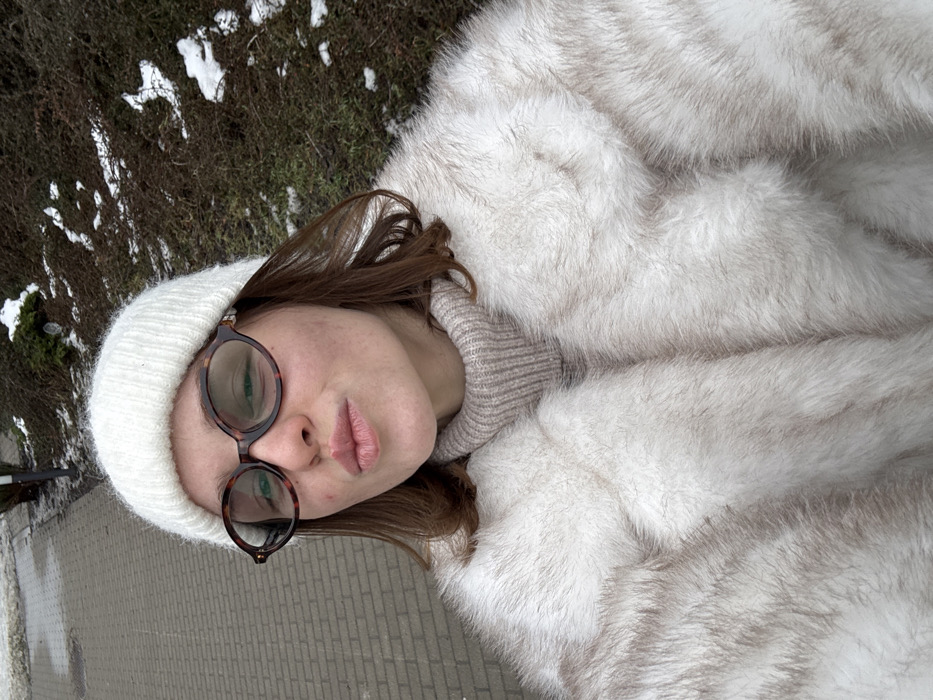 A young Caucasian female is depicted in a high-angle selfie, positioned centrally within the frame. She wears a cream-colored knitted beanie, large tortoiseshell-patterned oval glasses, a light beige ribbed turtleneck sweater, and a prominent fluffy faux fur coat in shades of off-white and pale brown. Her brown hair is visible around her face and shoulders. She is making a "kiss" gesture with her lips puckered forward, and her eyes are partially closed. Her complexion is visible, showing minor variations. The outdoor environment, identified as a residential or pedestrian area in Warsaw, Poland, indicates winter conditions. To the left, a reddish-brown brick-paved walkway, partially covered with patches of snow, recedes into the background. To the right, a slope covered with dormant bushes or shrubs displays scattered patches of snow and dark earth. A faint, blurred vertical object, possibly a lamp post, is visible in the upper left background. The scene is illuminated by natural daylight.