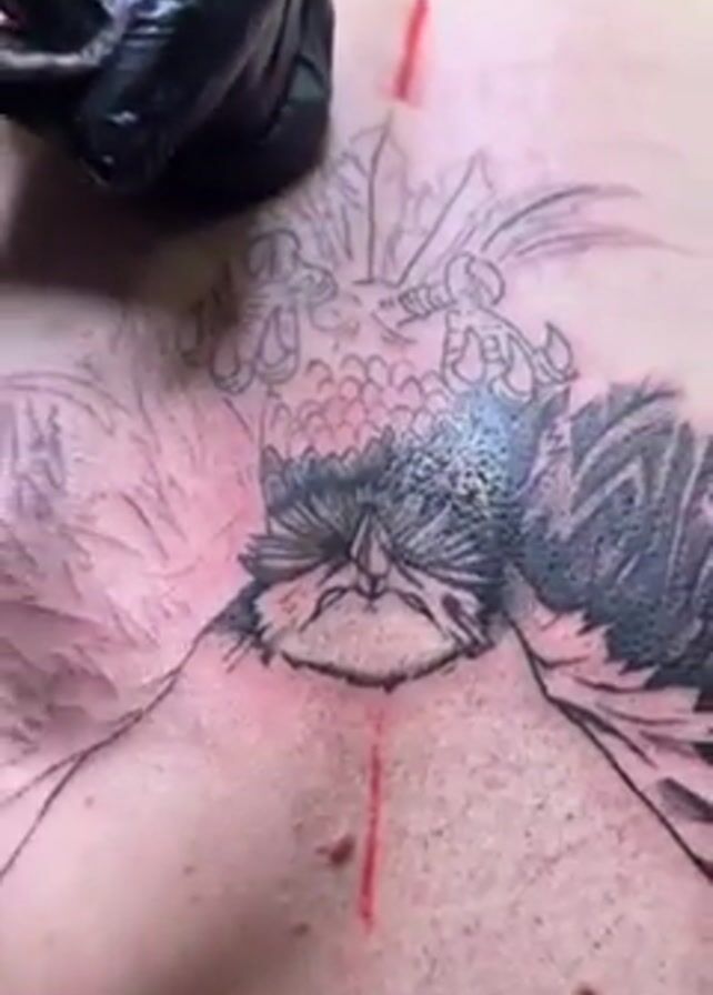 A tattoo artist wearing black gloves is working on a large bird tattoo on a person's upper back and chest. The tattoo is black and white and covers a significant portion of the upper torso. Two thin red lines have been drawn as guides on the person’s skin above the sternum. The artist appears to be wiping the tattooed area with a cloth or paper towel. The background is pink. The person being tattooed is lying on their back.