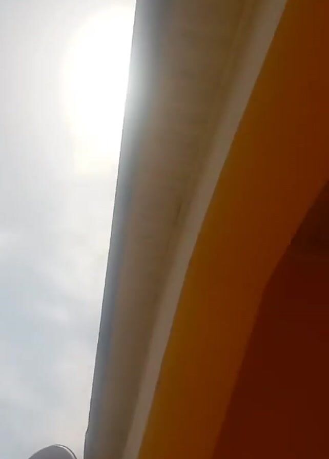 shot of the sky with the sun obscured by a ceiling. The sun appears as a bright, white orb in the sky, which is a pale blue with some clouds. In the foreground, there is a structure with a white ceiling and a section painted in a golden-yellow color. A satellite dish is visible in the lower left corner of the frame. The shot seems to be taken from a low angle, looking up at the sky.