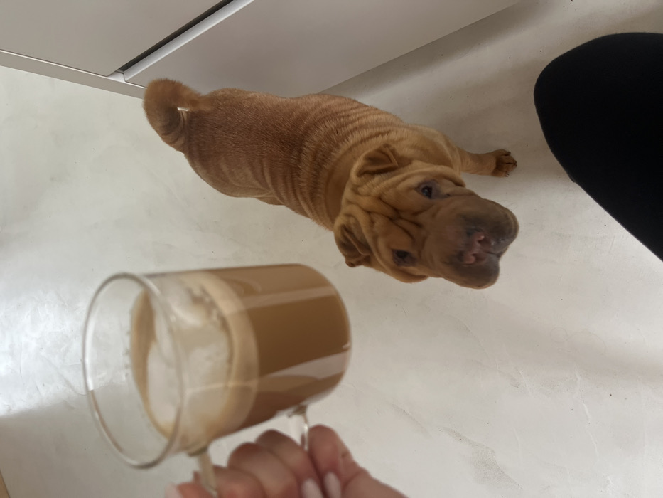 An indoor scene in Carency, France, captures a tan/fawn Shar-Pei dog standing on a light-colored, possibly concrete or tiled, floor, looking upwards. A human hand, exhibiting light-colored nail polish, holds a clear glass mug filled with a light brown, foamy beverage in the foreground, positioned to the left. To the lower right, a segment of a human leg clad in black fabric is visible. A light-colored cabinet or set of drawers is partially visible along the right edge of the frame.