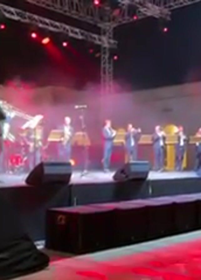 A concert stage is lit with bright red spotlights and filled with smoke effects as a band of seven men plays various instruments. They are dressed in matching dark suits and white shirts, standing in a line. One musician plays the trombone, another the saxophone, and the others play trumpets. Music stands are positioned in front of each of them. A black fabric barrier sits at the edge of the stage, partially obscuring the view. Behind the stage, the structure of a building is visible, with arched windows. A large LED screen is on the right of the building. In the foreground, a person's head is partially visible on the right side of the frame. The ground in front of the stage is brightly lit and shows abstract red patterns.